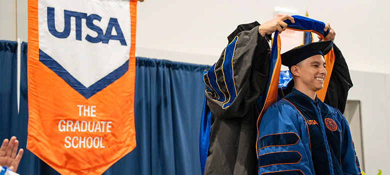 Scheduled at 7 p.m. on Thursday, December 7, graduating doctoral students will participate in the doctoral hooding ceremony. At this memorable celebration, each UTSA graduate will be introduced one-by-one, to cross the stage and accept their Ph.D. degree. While on stage, a faculty member and/or advisor will drape the doctoral hood over the graduate’s head and rest it on their shoulders in front of a community of family members and friends. This year’s celebration will be held in the H-E-B Student Union Ballrooms on the Main Campus.