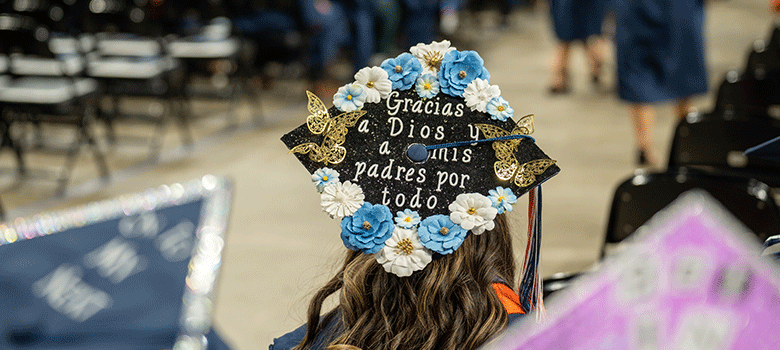 Over the years, guests have taken note of the many brightly decorated mortarboards that students wear. UTSA students have embraced the tradition of sprucing up their mortarboards with individualized art and special messages to help them stand out in the crowd on Commencement day.