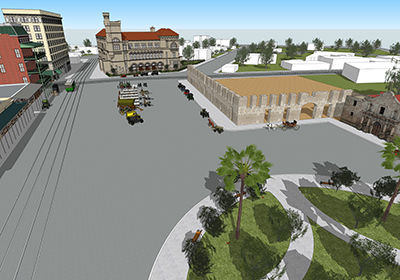 In a circa 1912 model created by UTSA, users can explore a painstaking re-creation of Alamo Plaza that includes the buildings around the Alamo designed and modeled to their historical specifications. Virtual depictions of San Antonio citizens stroll the plaza surrounded by Ford Model T cars, horses and carriages, and figures depicting the famous Chili Queens of San Antonio.
