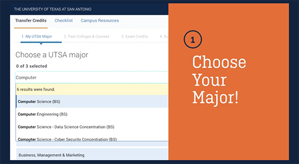 UTSA’s online calculator is the only resource of its kind in San Antonio and in South Texas and is one of few that is available at any university in Texas. The calculator offers personalized information for each student’s major and lets prospective students record every college credit they have earned from the institutions they have attended.