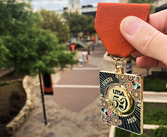 A favorite Fiesta activity is collecting Fiesta medals. The 2019 UTSA Fiesta medal celebrates the university’s 50th birthday. It’s on sale now for $8 at Roadrunner Express on Main Campus. Many other UTSA colleges, departments, offices and student organizations also have their own unique Fiesta medal.