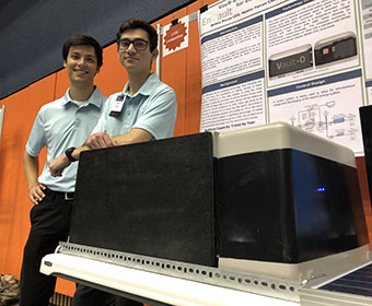 Noah Bemisderfer and Nestor Falcon stand beside the Vault-O battery-powered mobile generator.