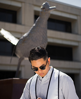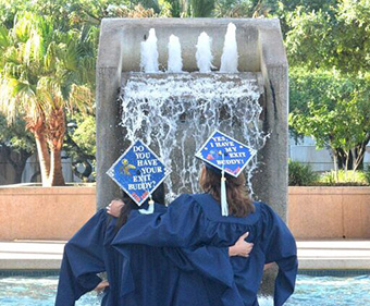 Want a graduation photo that bursts with school pride while also providing intriguing visual depth? You can achieve both in spades by snapping pics in front of a row of UTSA banners. While you can spot banners all over the Main and Downtown campuses, there are two ideal photo spots: 1) In front of the U-T-S-A letter banners located in the Paseo Principal between the Student Union and H-E-B Student Union; 2) Near the longest row of university banners stretching south from the North Paseo Building through the Paseo del Norte.