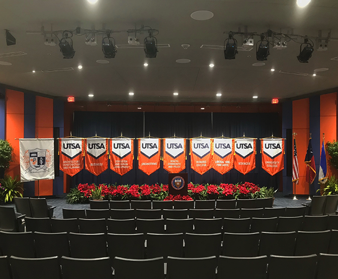 We know there are many people disappointed that they won’t be able to walk the Commencement stage at the Alamodome this month due to the coronavirus pandemic, but UTSA has arranged a superb alternative at the Retama Auditorium (Student Union 2.02.02). The university has put together a “mock” Commencement stage for those interested in taking photos of their graduates. The auditorium will be open from 8 a.m. to 8 p.m. on December 2-4 and December 7-9, so rehearse your best stage-crossing poses this week!
