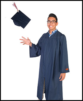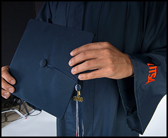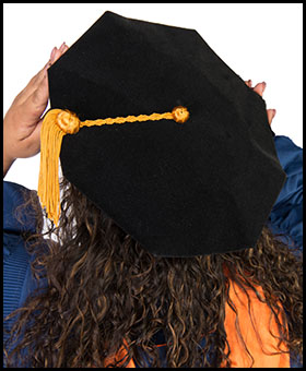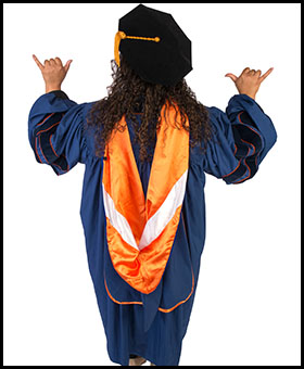 At UTSA the gowns and mortarboards are navy blue. The style of the gowns vary depending on the degree the student receives. The sleeves of the gowns worn by the master’s degree recipients are square at the end. The doctoral degree recipients’ gowns have flowing sleeves with three bars of velvet and a facing of velvet down the front with the UTSA seal. The velvet trim is five inches wide for the doctoral degree. The color of the velvet border indicates the degree and align with the tassel colors listed below.