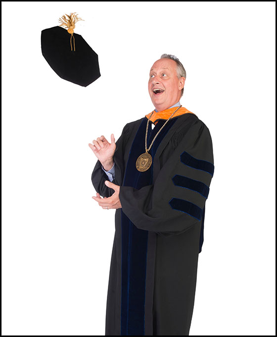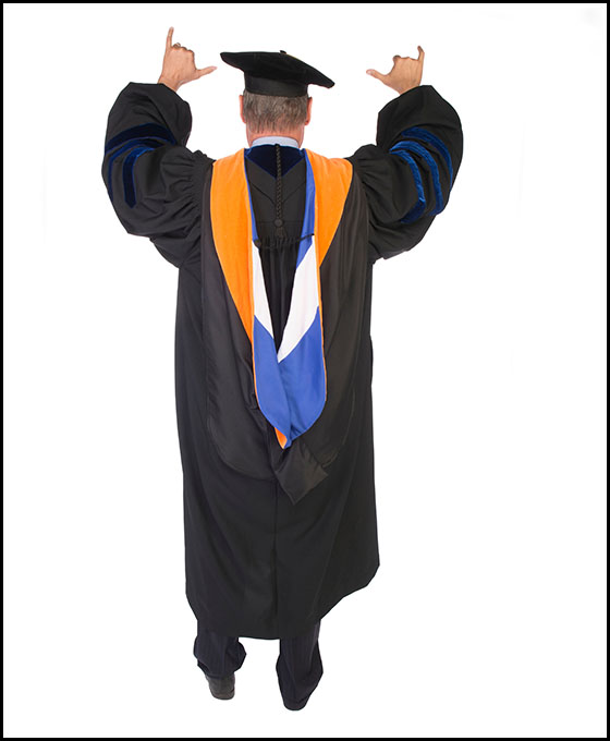 UTSA leadership and faculty wear the robe specific to the university where they earned their highest degree. President Taylor Eighmy’s regalia is indicative of the University of New Hampshire, where he earned his Ph.D. in environmental engineering. Eighmy is in the Roadrunner spirit with his orange hood, which actually signifies his engineering degree. He also wears the UTSA Presidential Medallion, which symbolizes the authority and responsibility vested in the President. The brass medallion has the university seal on one side and the words “Presented by the UTSA Development Board in honor of the University’s 25th anniversary—1994” on the other side.