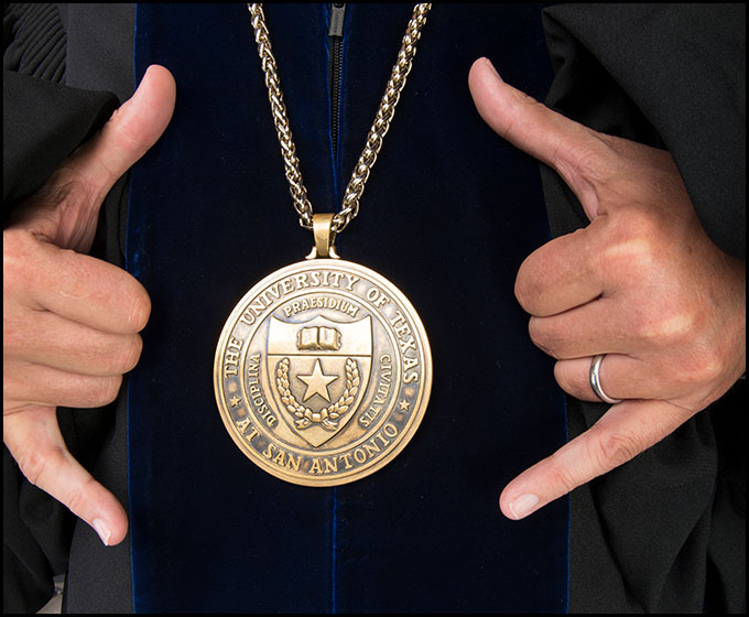 President Eighmy’s hood represents his Ph.D. in environmental engineering. He also wears the UTSA Presidential Medallion.