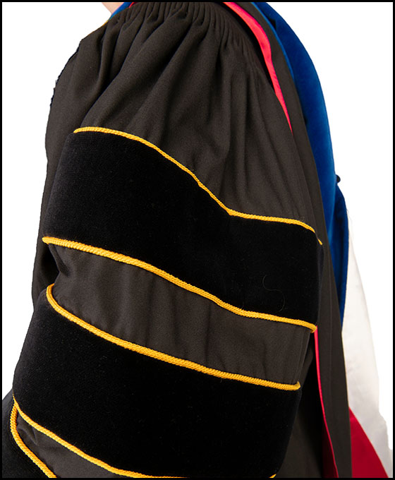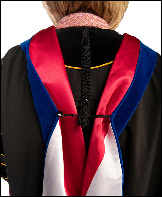 Provost and Senior Vice President for Academic Affairs Kimberly Andrews Espy purchased her regalia when she was a faculty member at Southern Illinois University and needed it to participate in the hooding of her first doctoral student. The hood is red and white, representing her doctoral alma mater, University of Houston, and the piping on the sleeve chevrons is gold, representing her science degree. Her favorite features of the gown are the buttons that anchor the hood in place: one hidden inside the zipper and another on the back. Another distinguishing feature of her regalia is what it lacks—like a number of faculty, Espy eschews tradition by wearing neither a tam nor mortarboard at ceremonies.