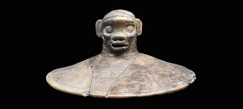 This lid with a monkey-shaped handle dates back to 450 A.D. It was recovered by UTSA archaeologists in a Maya royal tomb in Belize and is being displayed in Nature, Power, and Maya Royals at the San Antonio Museum of Art.