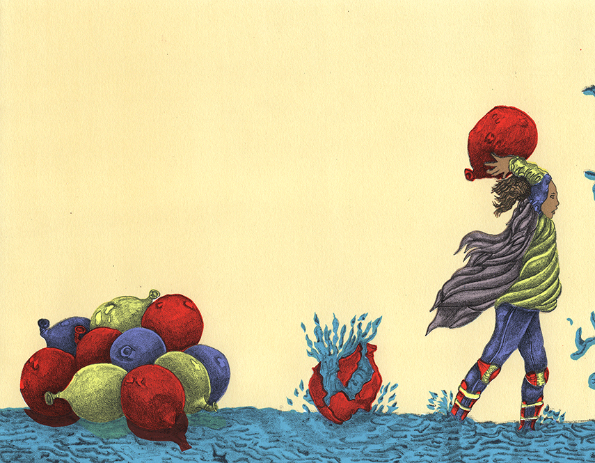 Saenz’s “Pelea de Globos”A lot of your work centers around telling the immigrant experience and the issues affecting the migrant communities along the border. How has printmaking allowed you to do that?