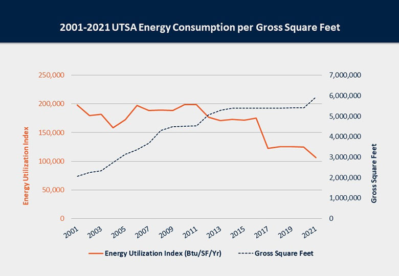 In 2001, the UT System Energy Utilization Task Force (EUTF) set an energy reduction stretch goal for UTSA to decrease its EUI by 20% over the next 20 years, a goal which the university has exceeded. In 2020, Facilities’ Energy and Utilities Management team reported that the university’s EUI had decreased by 37% since 2001. During this time, the square footage increased by 182% due to the more recent additions of the Science & Engineering Building (SEB), the Student Success Center, the Roadrunner Athletics Center of Excellence, the Mesquite Living Laboratory and Guadalupe Hall.