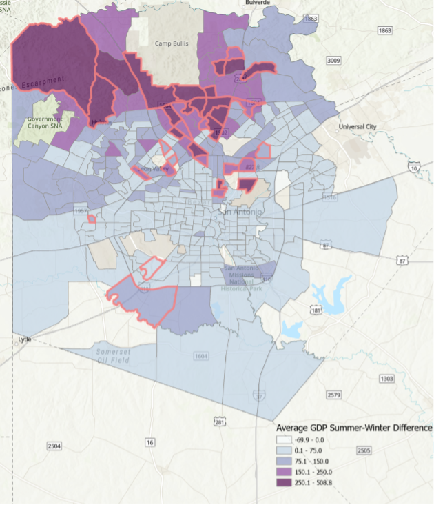Figure 1 shows summer-winter differences in average gallons of water per day, census tracts, Bexar County, Texas, 2009-2016.“Our conclusion from this was that one strategy to try to reduce the demand and promote conservation that hopefully would result in reducing the overall cost of water is to put some sort of tiered structure in place,” Potter said.