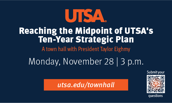 On November 28, we invite you to join us for an engaging conversation between me and Senior Director of Strategic Initiatives Dr. Lisa Jasinski as she poses questions to explore the key elements of UTSA’s strategic plan, the purpose of our mid-point refresh, and how we can all play a role in advancing its progress. The town hall will be a hybrid event, and regardless of how you choose to join us, we hope you’ll submit questions to be asked during our conversation. Questions can be submitted in advance or in real-time during the event.