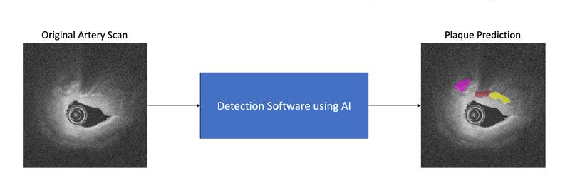 This diagram shows how detection software using AI can assist doctors in understanding the composition of coronary plaque. This kind of automated detection can relieve doctors from the burden of searching numerous heart scans for plaque. It can also increase the value and use of OCT systems in clinical use.