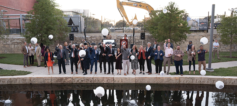 Attendees were asked to name an innovator or entrepreneur to honor at the ceremony as they each placed a floating globe in the creek. In attendance were Bexar County Judge Peter Sakai and San Antonio Mayor Ron Nirenberg, who each made remarks during the event.