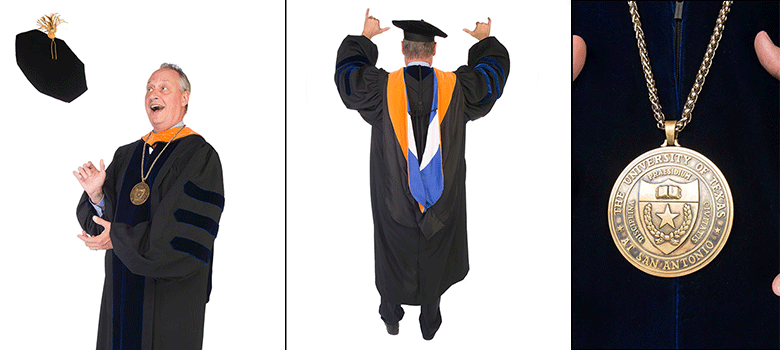 UTSA leadership and faculty wear robes representing the university where they earned their highest degree. President Taylor Eighmy’s regalia, for example, is from the University of New Hampshire, where he earned his Ph.D. in Environmental Engineering. Eighmy’s orange hood likewise signifies his engineering degree.