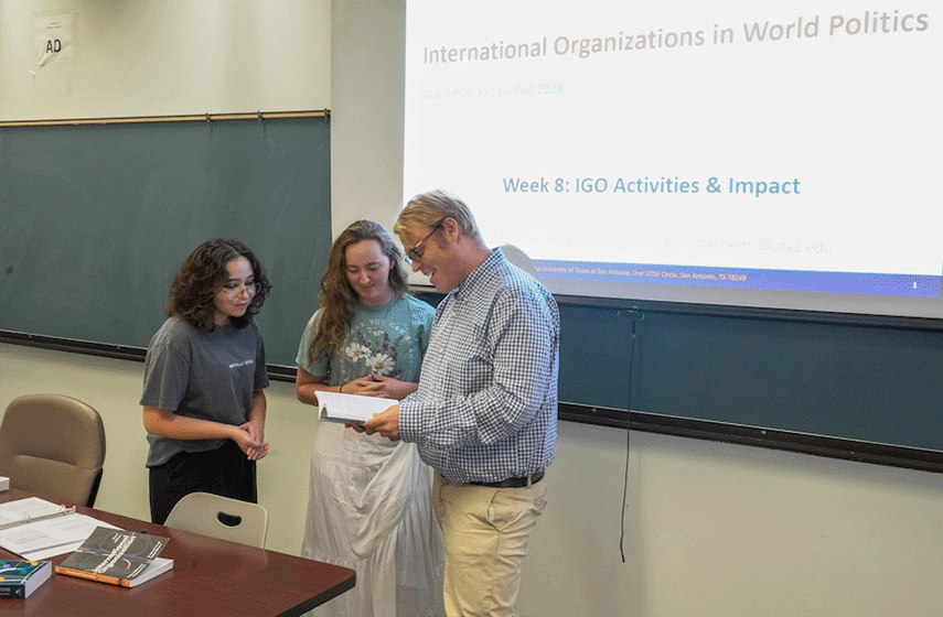 Hofferberth also serves as program coordinator for the M.A. in Global Affairs and as the faculty advisor for the UTSA Sigma Iota Rho Honor Society and the UTSA Model United Nations Society. As the Model UN advisor, Hofferberth provides fundamental experiential learning opportunities for his students at events like the annual Alamo Model UN conference, where they are introduced to real-world issues and challenges while developing skills like critical thinking, diplomacy and negotiation.
